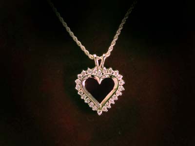 This heart necklace has .50 pts. in diamonds and hangs on a 18" 14K solid rope chain. Available in 14K White or Yellow gold.