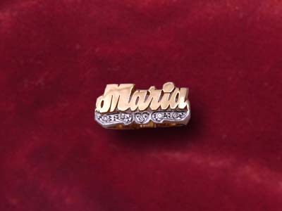 Our custom made name rings are hand-crafted in 14K gold. Finished with a fancy white gold tail and set with 5 diamonds, this piece is buffed to a high polish.
