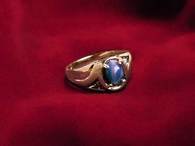 This fancy men's ring contains a star sapphire center stone and has 1½ pts. of diamonds on each side. Available in sizes 8-12. For a larger size, please email us at irasgoldennugget@aol.com (please include style number).