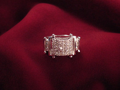 This stunning ladie's ring has .75 pts of diamonds set in 14KT white gold. Ring is available in sizes 4-8. For larger sizes, please email us at irasgoldennugget@aol.com (please include style number).