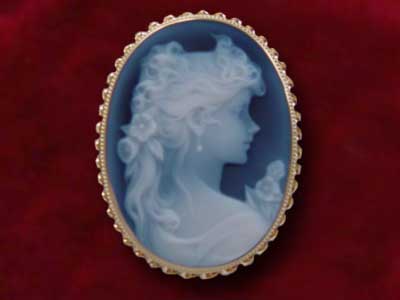 This 14 kt.gold blue agate cameo is 30mm. x 40mm. with a handcrafted double twist frame. It can be worn as either a broach or a pendant.